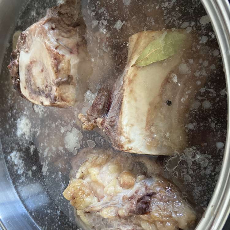 I gryde: Læg knogler i gryden, tilsæt eddike og dæk med koldt vand 4–5 cm over. Lad trække 20–30 min før opvarmning.