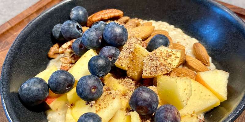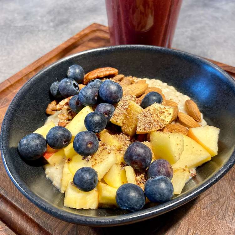 Toppes med 1 spsk peanutbutter, tahin eller mandelsmør, bær, frugt, mandler, nødder, ristede kerner 1 spsk kværnede hørfrø.