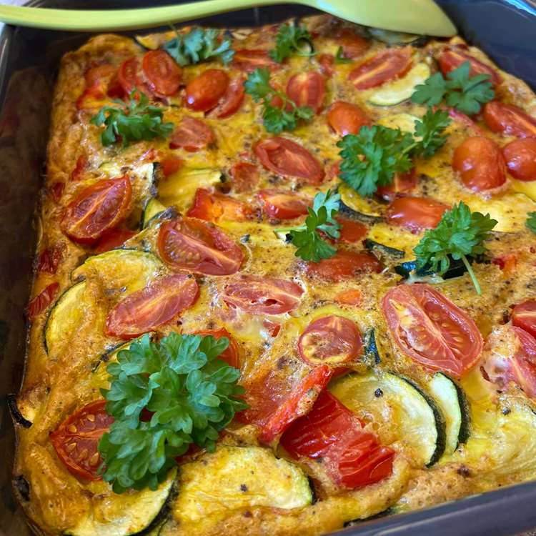 Æggene piskes og tilsættes krydderier, æggemassen vendes med de bagte grøntsager, pyntes med tomater. Bages i ca 35 min v. 200 grader.
